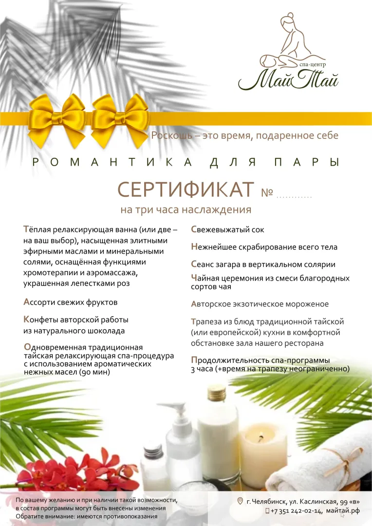 - Тёплая релаксирующая ванна (или две - на ваш выбор), насыщенная элитными эфирными маслами и минеральными солями, оснащённая функциями хромотерапии и аэромассажа, украшенная лепестками роз